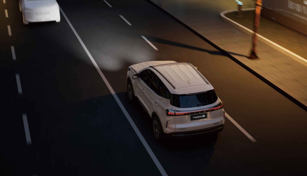 A TIGGO 4 automatikus távolsági fényszóró vezérlése csökkenti a vakító fény okozta balesetek kockázatát. Érzékeli a szembejövő járművek fényszóróit, és automatikusan tompítja a távolsági fényt.